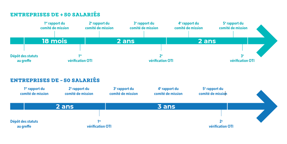 - une instance de contrôle de la mission, qui peut prendre la forme d’un Comité de mission (ou, pour les plus petites, d’un référent de mission interne), chargé de suivre l’avancement de ces objectifs.