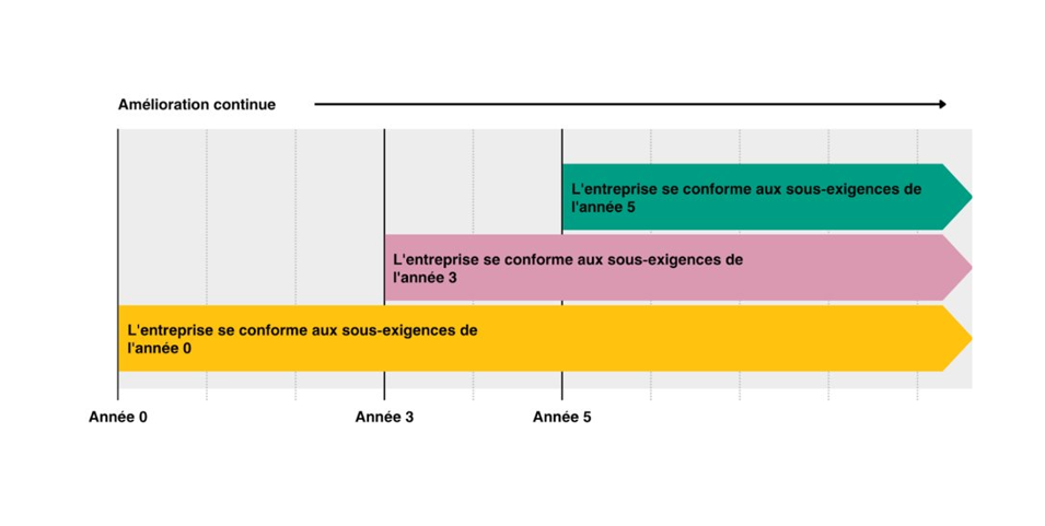 Un autre élément structurant est l’amélioration continue intégrée au cœur du référentiel : les entreprises doivent non seulement répondre à des seuils minimaux, mais démontrer un plan d’évolution sur plusieurs cycles de certification, encourageant une progression mesurable de leurs pratiques.